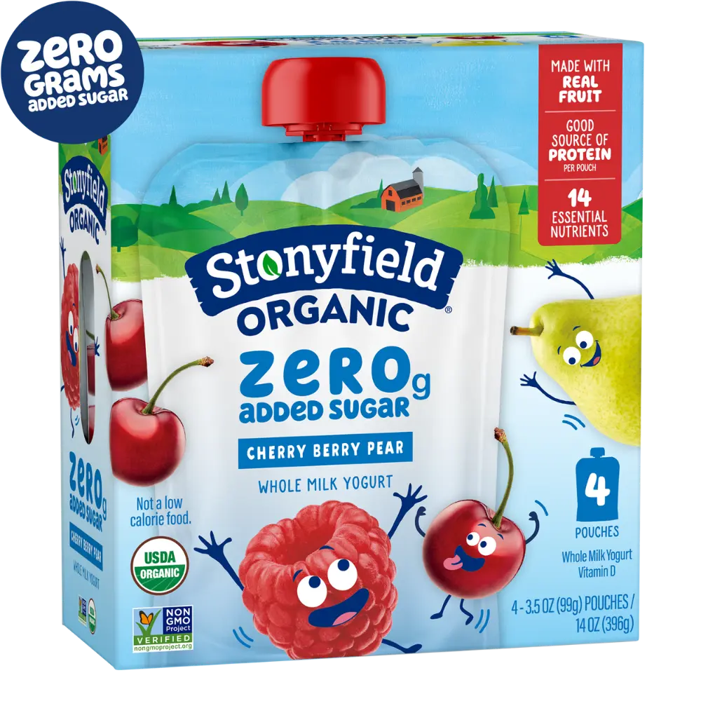 Stonyfield Organic Kids Zero Grams Added Sugar Cherry Berry Pear Whole Milk Yogurt Pouch, 4Ct