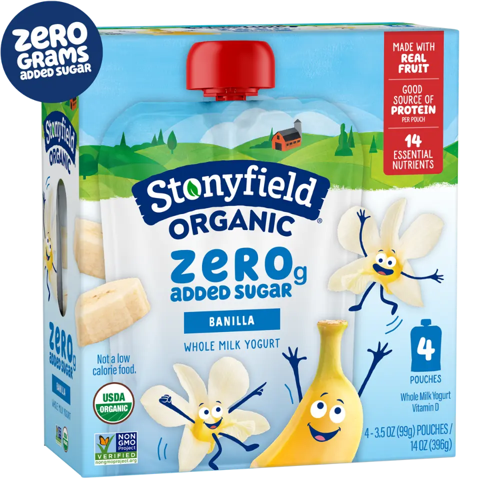 Stonyfield Organic Kids Zero Grams Added Sugar Banilla Whole Milk Yogurt Pouch, 4 ct
